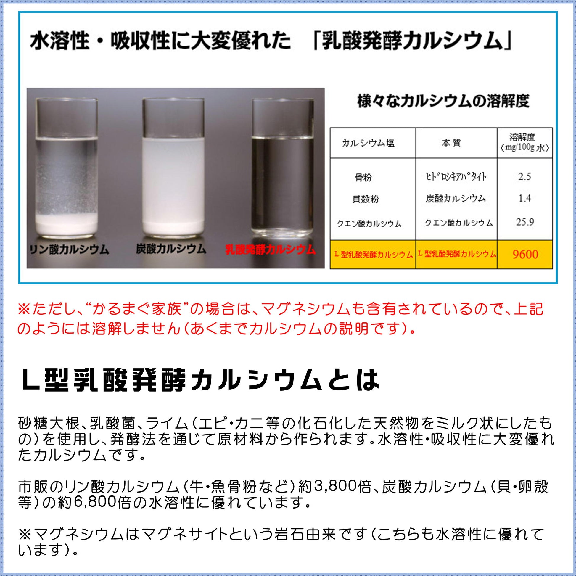 砂糖大根、乳酸菌、ライム(エビ・カニ等の化石化した天然物をミルク状にしたもの)を使用し、発酵法を通じて原材料から作られます。水溶性・吸収性に大変優れたL型発酵乳酸カルシウムです。市販のリン酸カルシウム(牛、魚骨粉など)の約3,800倍、炭酸カルシウム(貝、卵殻等)の約6,800倍の水溶性に優れています。