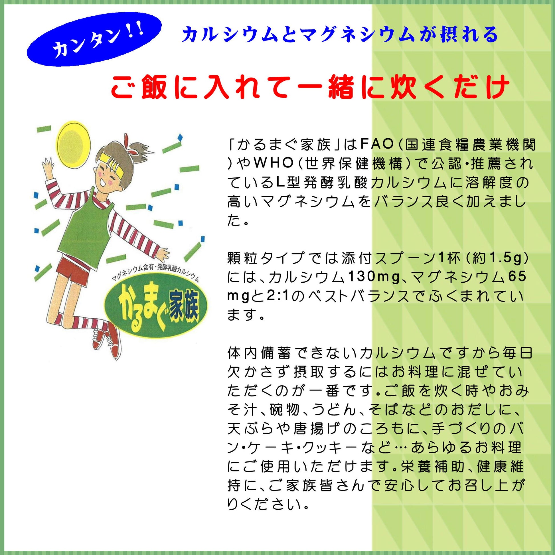 「かるまぐ家族」はFAO(国連食糧農業機関)やWHO(世界保健機構)で公認・推薦されているL型発酵乳酸カルシウムに溶解度の高いマグネシウムをバランス良く加えました。