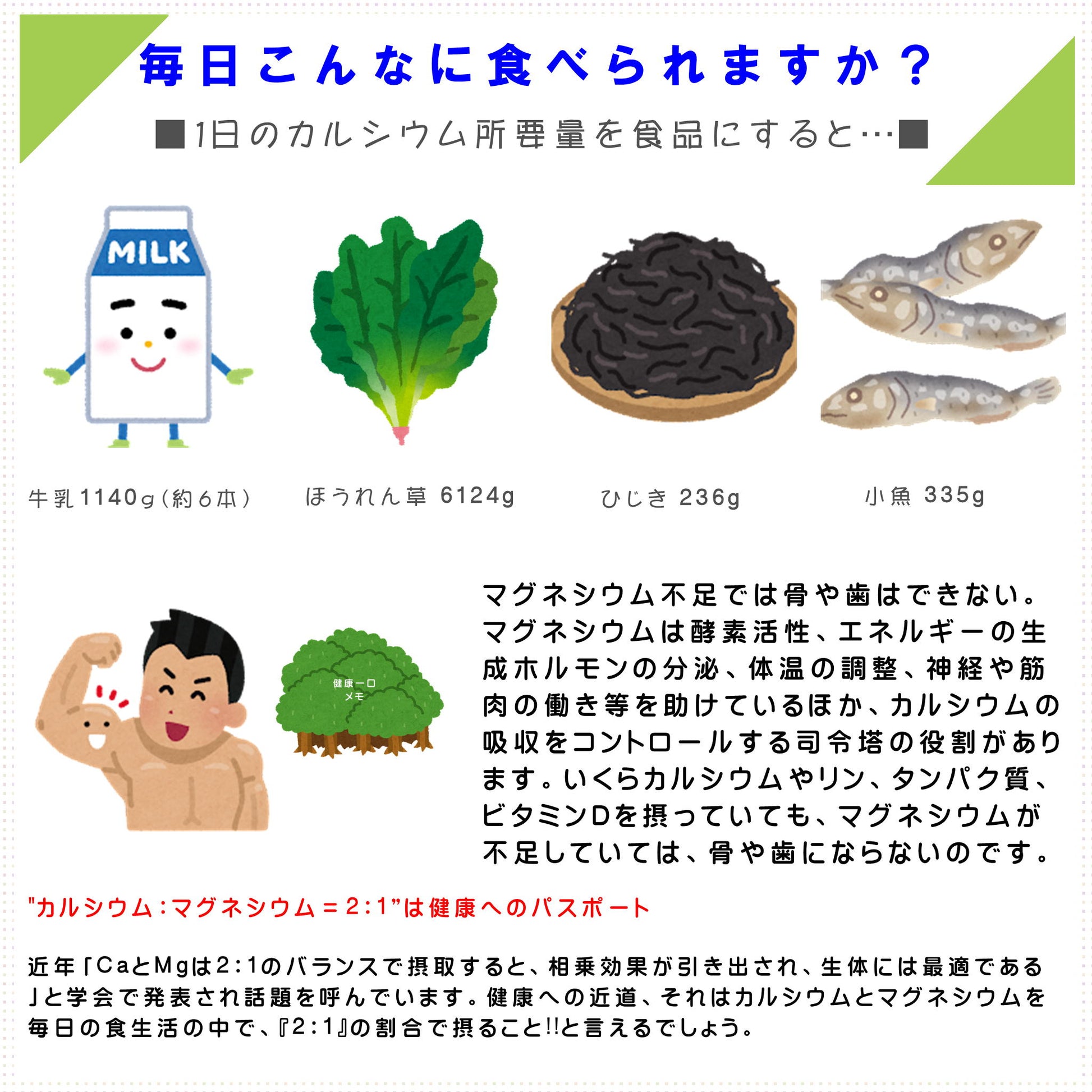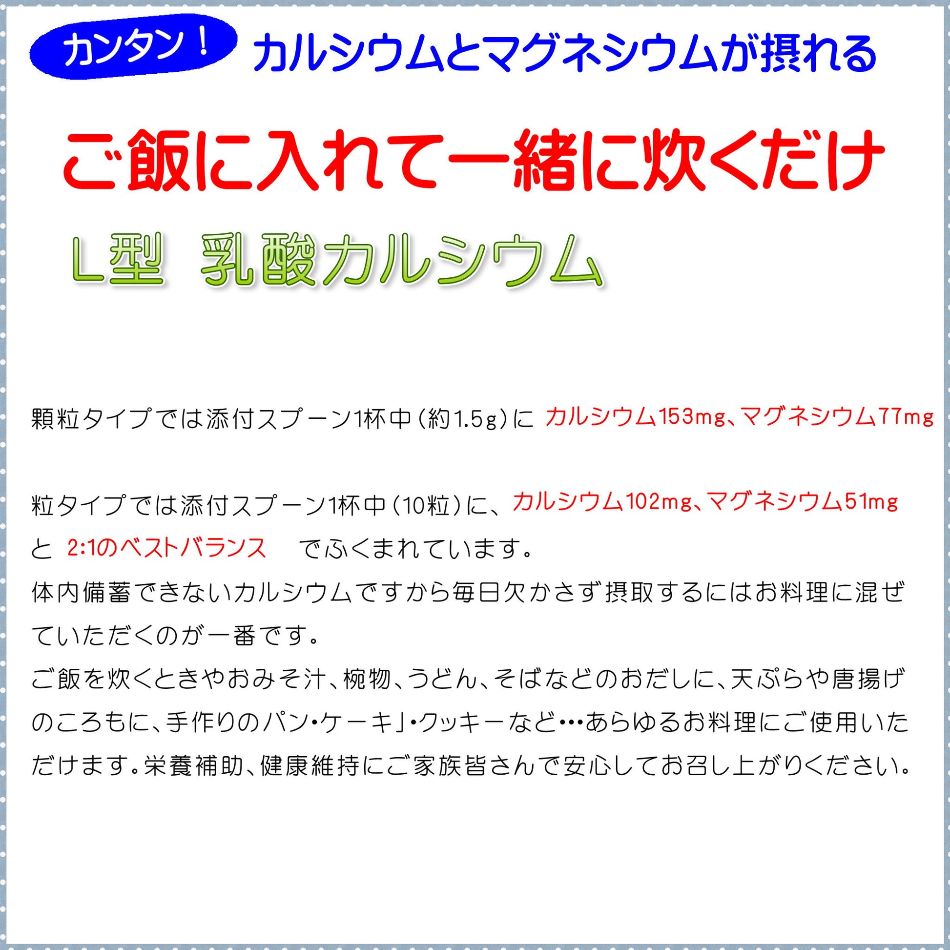 顆粒タイプでは添付スプーン1杯(約1.5g)に、カルシウム153mg、マグネシウム77mgと2:1のベストバランスで含まれています。