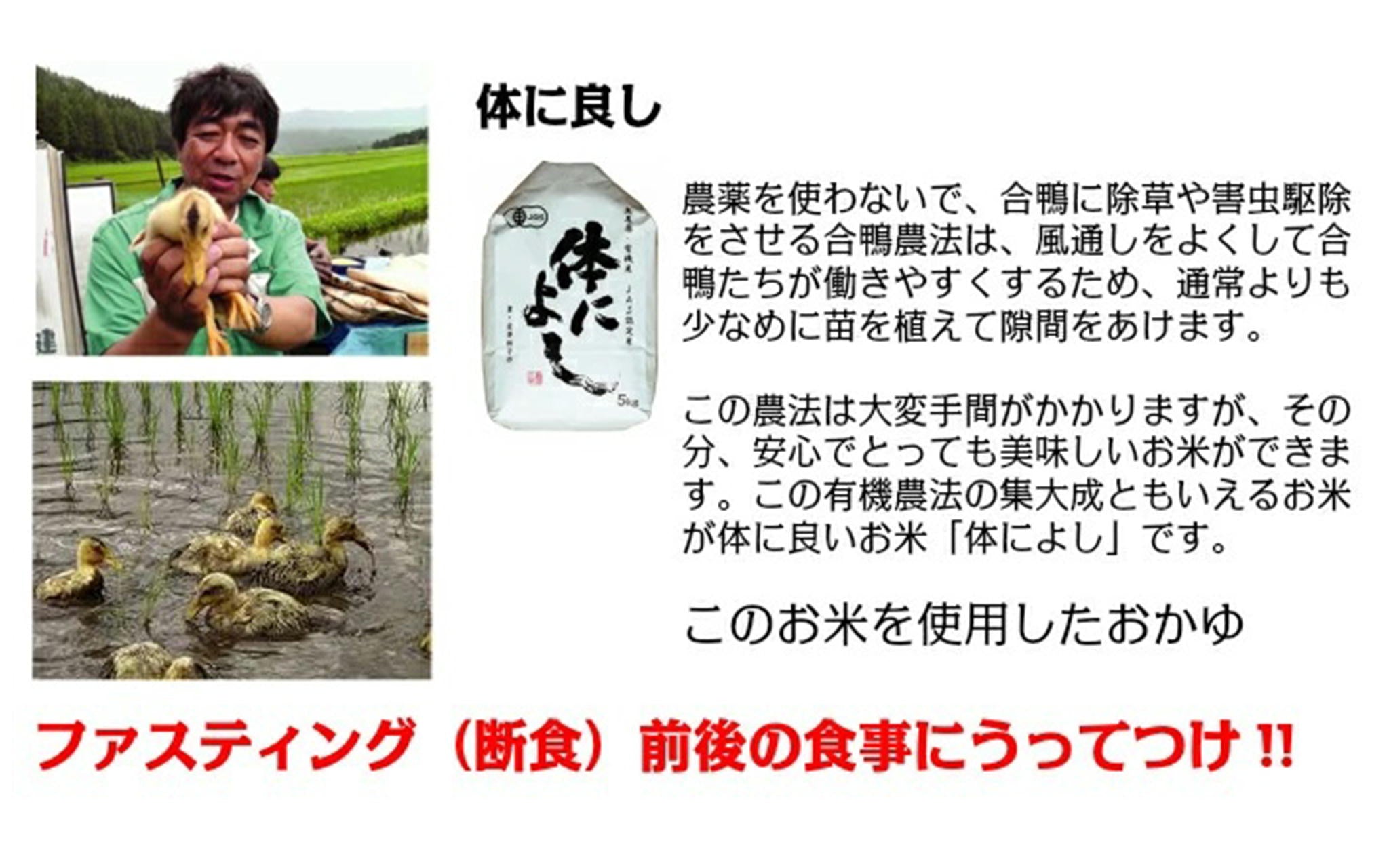 有機無農薬・合鴨農法でつくられた有機米「体によし」を使用する事で、風味豊かで栄養満点のおかゆができました。 そのままでももちろん。ファスティングの前後の食事にもご利用いただけます。「安心・安全・美味しい」三拍子そろったお粥です。