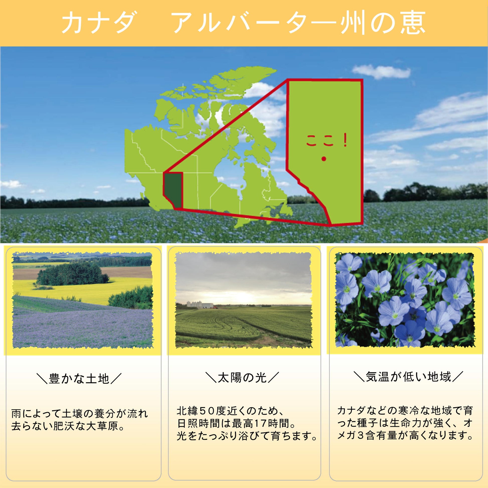 ①豊かな土地…雨によって有機肥が流れ去らない肥沃な大草原。②豊かな太陽の光…北緯60度近くのため、たっぷり光を浴びる。日照時間は最高17時間と長く、③気温が低い地域…カナダなど寒冷地での種子は、含有量が高くなり、かつ生長する生命力が強く、その条件が薬効性を高めていくという結果につながる。オメガ3