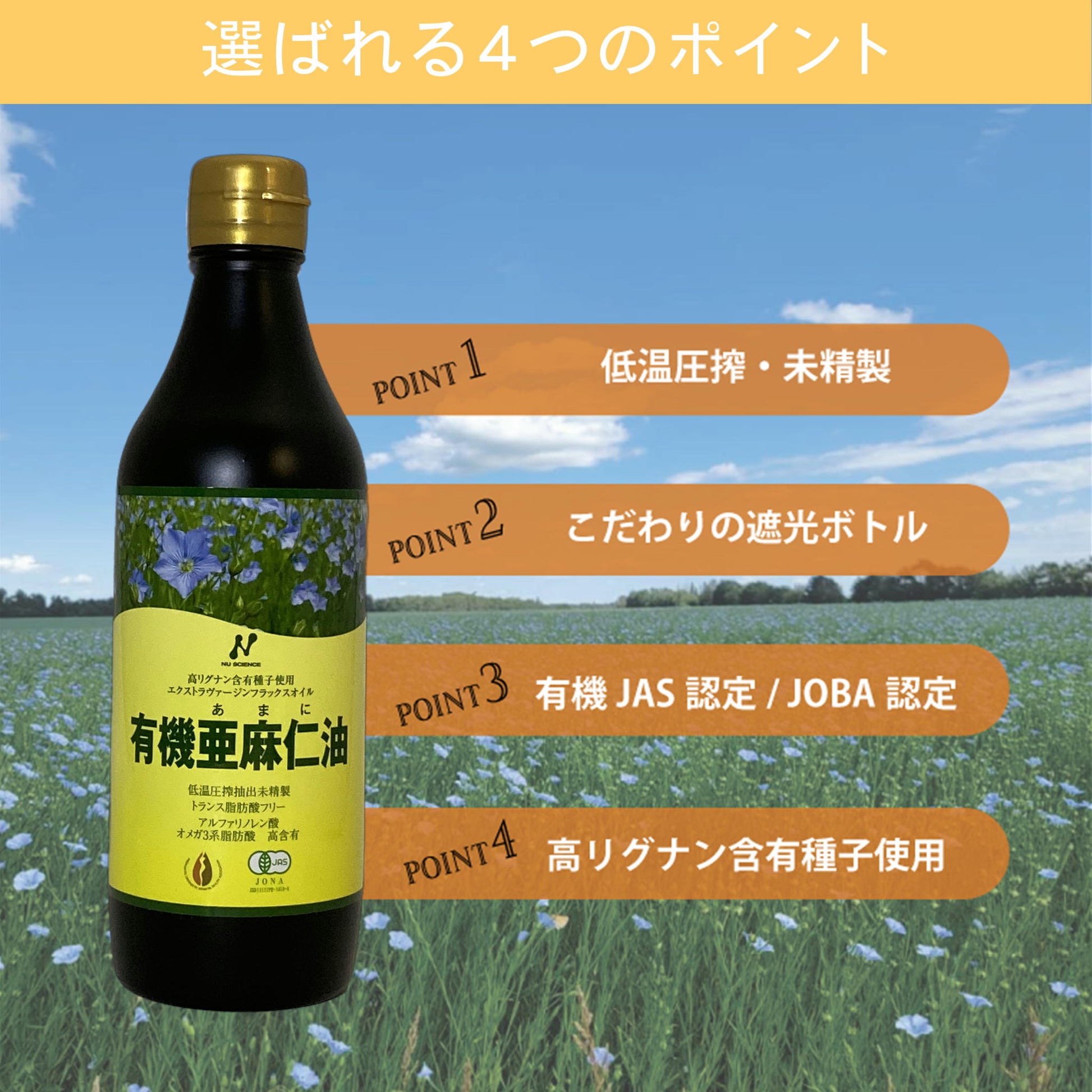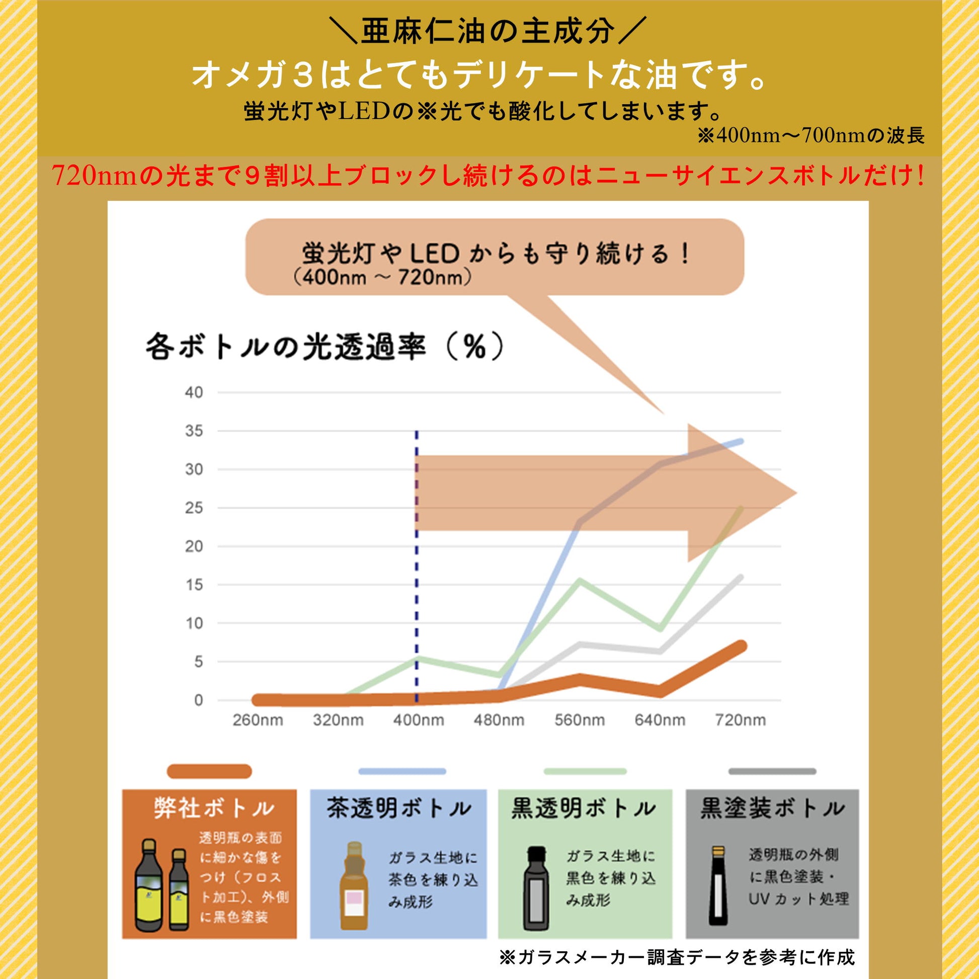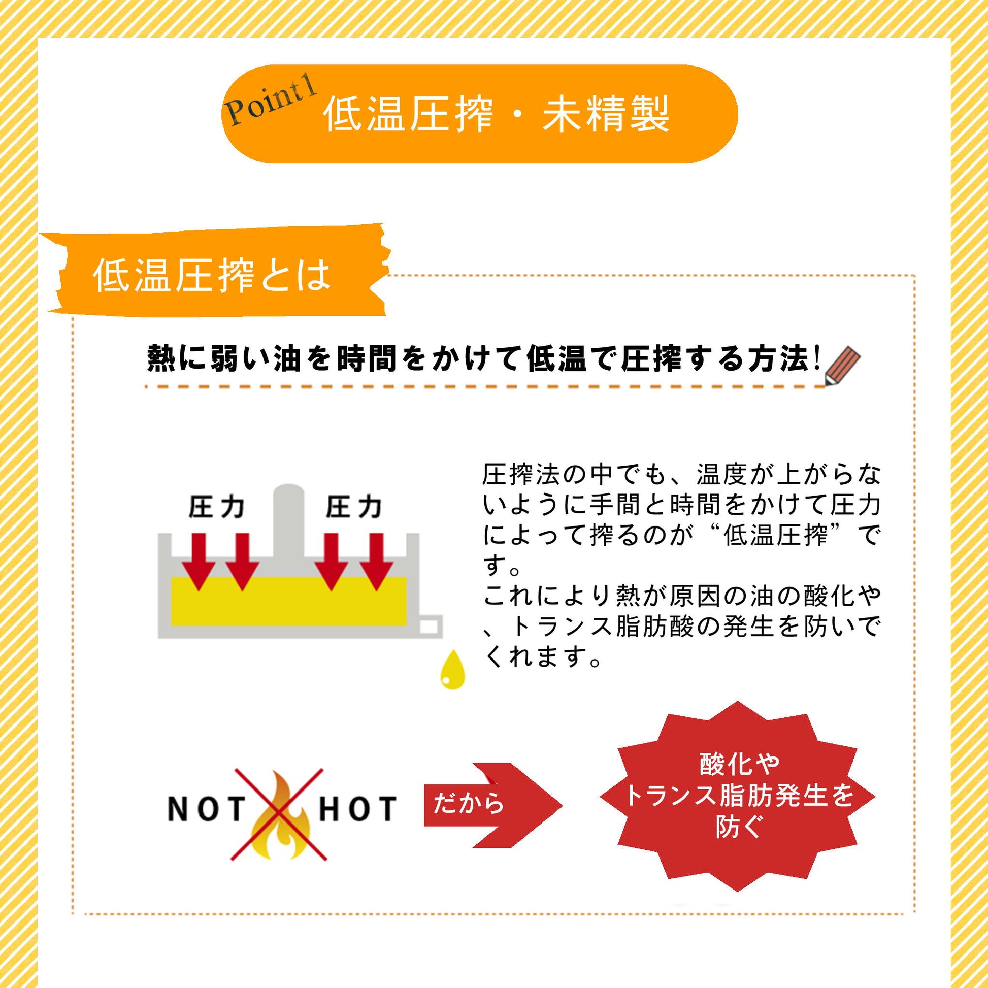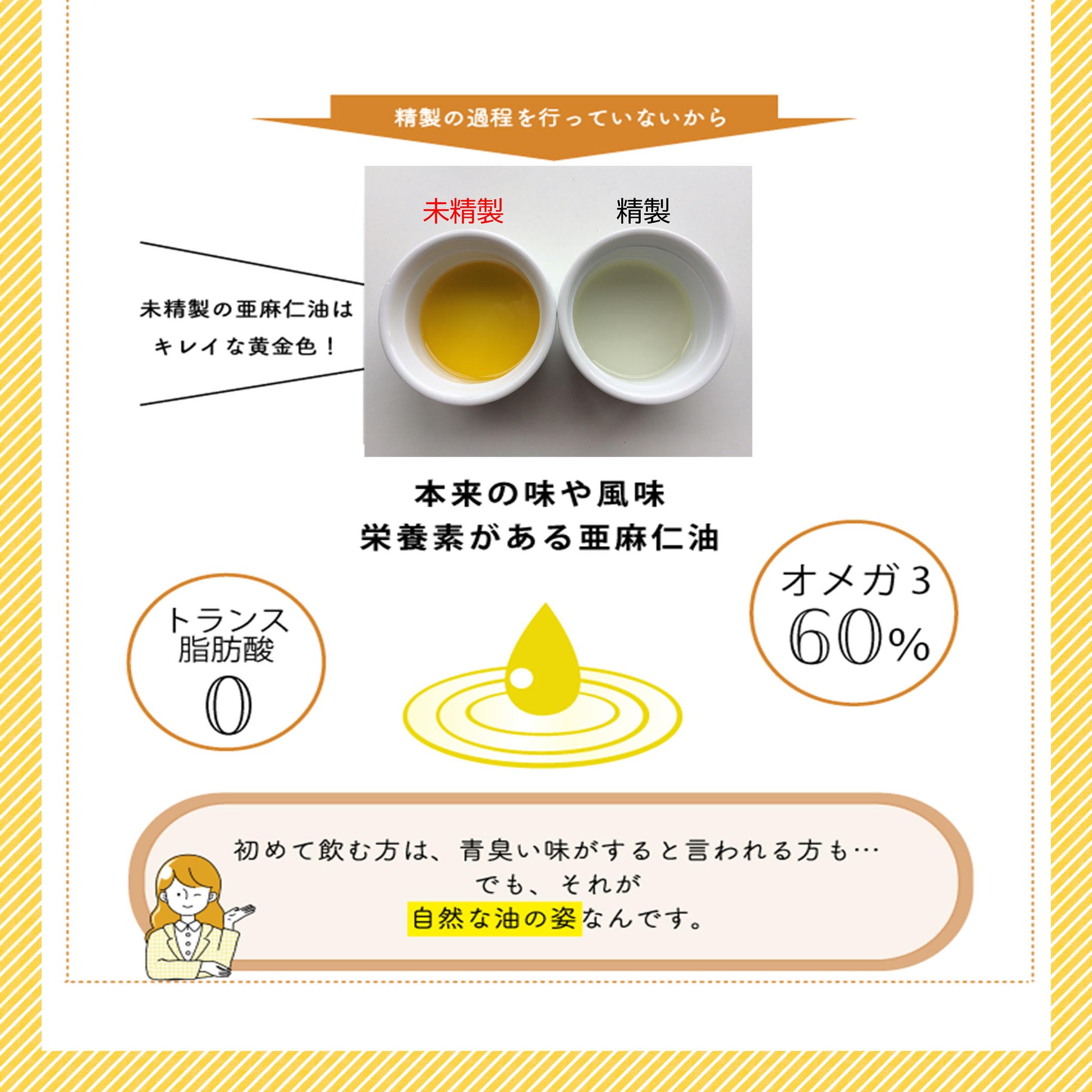 フラックス(亜麻)の名産地カナダ・アルバーター州のゴールデンフラックスシードを低温圧搾抽出し、未精製はもちろんのこと高級感あふれる黒ガラスボトルで紫外線を100%カットします。