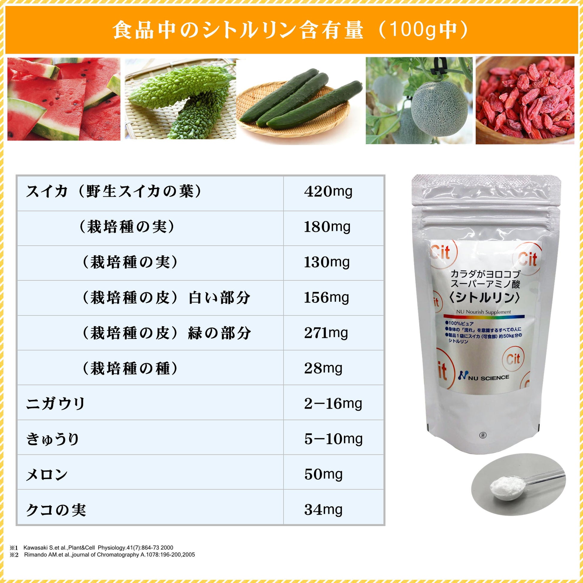 - スイカ果汁から発見され、その学名:Citrullus vulgarisから命名
