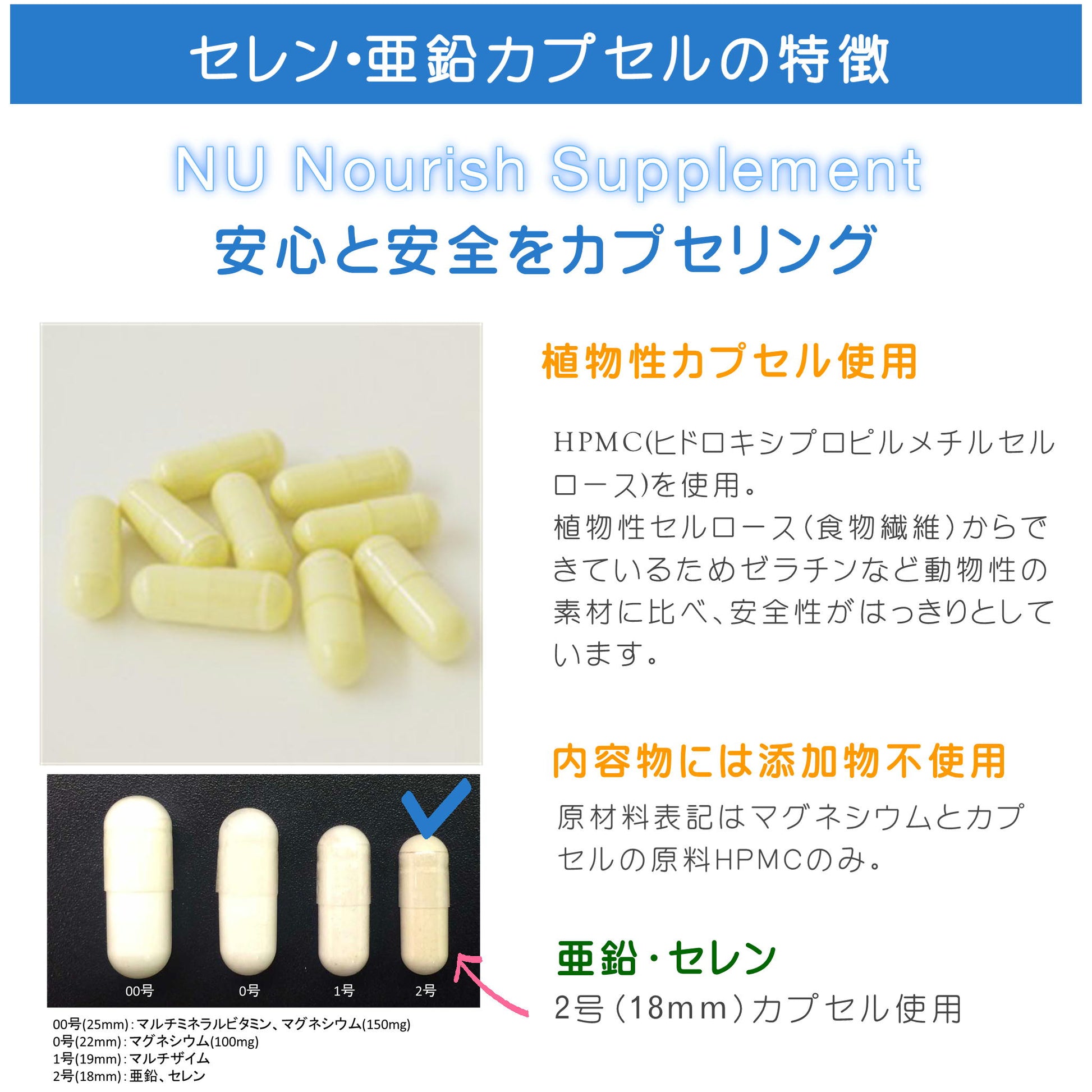 原材料表記は各ミネラル酵母とカプセルの原料プルランのみ。※セレンのみ体積が不足しカプセル化が難しいためビール酵母を入れております。