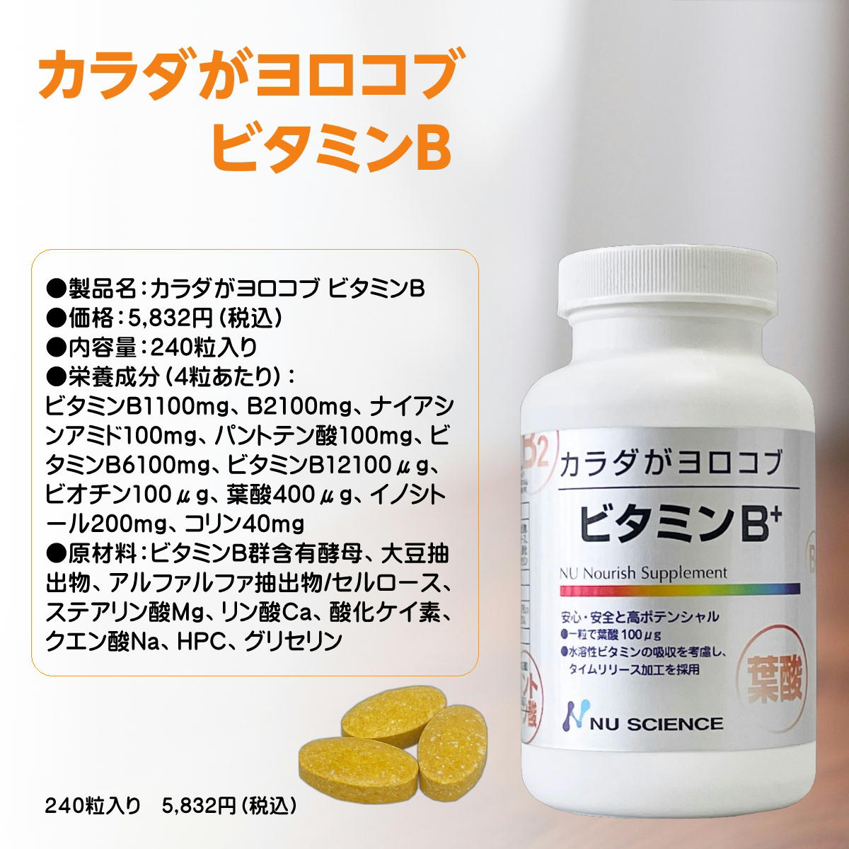 栄養表示 | 4粒(2.5g)当たり: エネルギー 8.6kcal タンパク質 0.5g 脂質 0.2g 炭水化物 1.2g 食塩相当量 0.02g ビタミンB1 100mg、ビタミンB2 100mg、ナイアシンアミド 100mg、パントテン酸 100mg、ビタミンB6 100mg、ビタミンB12 100μg、ビオチン 100μg、葉酸 400μg、イノシトール 200mg、コリン 40mg |