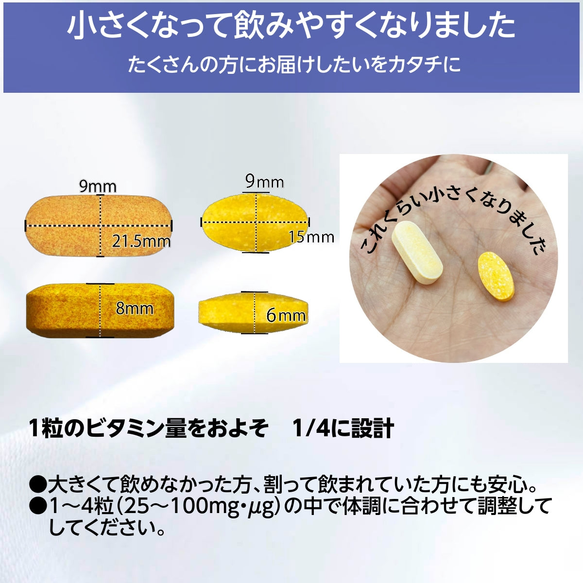 大きくて飲めなかった方、割って飲まれていた方にも安心。 1~4粒(25~100mg・㎍)の中で体調やご年齢に合わせて飲用量が調整できるのも◎ ※従来品1粒分の栄養素を4粒摂取にて満たす設計です。
