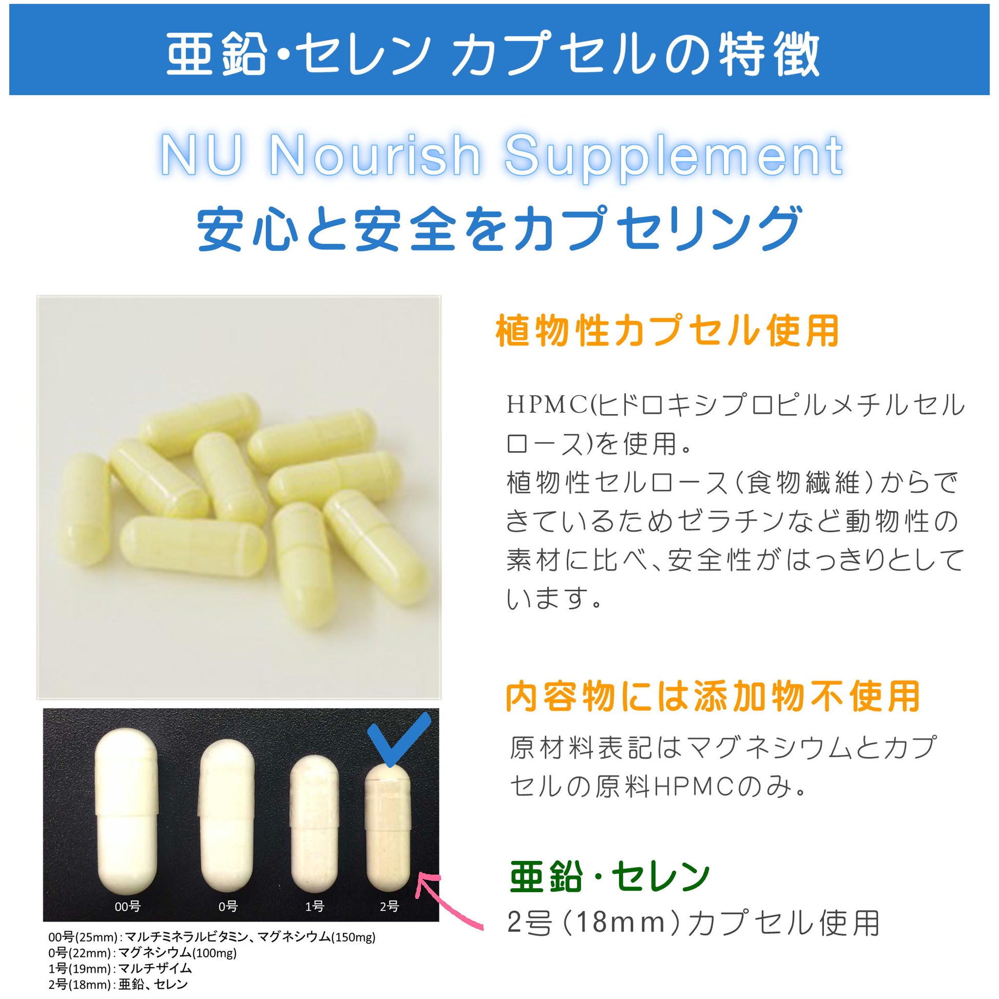 原材料表記は各ミネラル酵母とカプセルの原料プルランのみ。※セレンのみ体積が不足しカプセル化が難しいためビール酵母を入れております。
