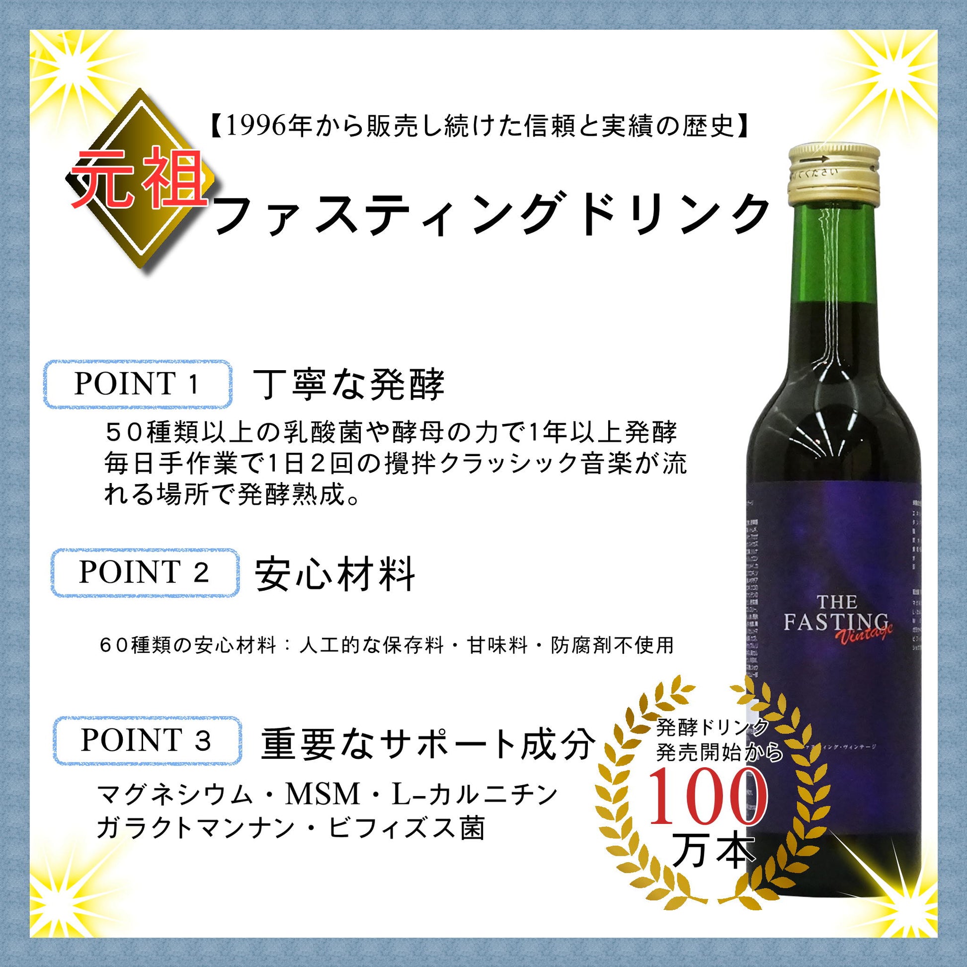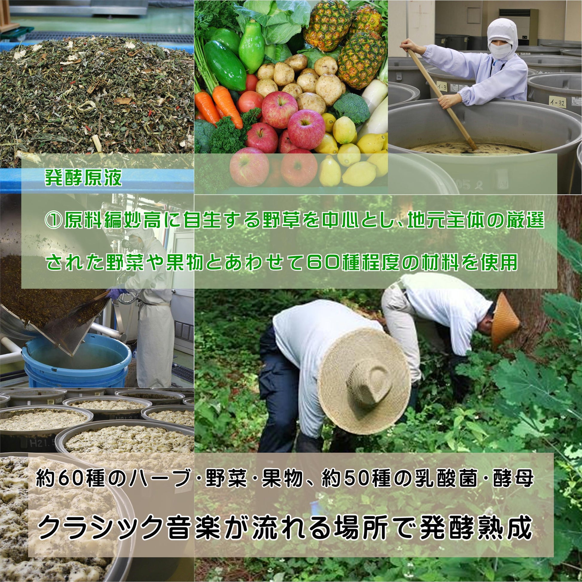 約60種類の原材料を、50種類以上の乳酸菌や酵母の力で自然発酵、自然熟成させ、さらに、「山田式ミネラルファスティング」に欠かせないマグネシウム、L-カルニチン、MSM(硫黄)、厳選されたビフィズス菌を加えた、体にやさしい100%(※)発酵飲料です。