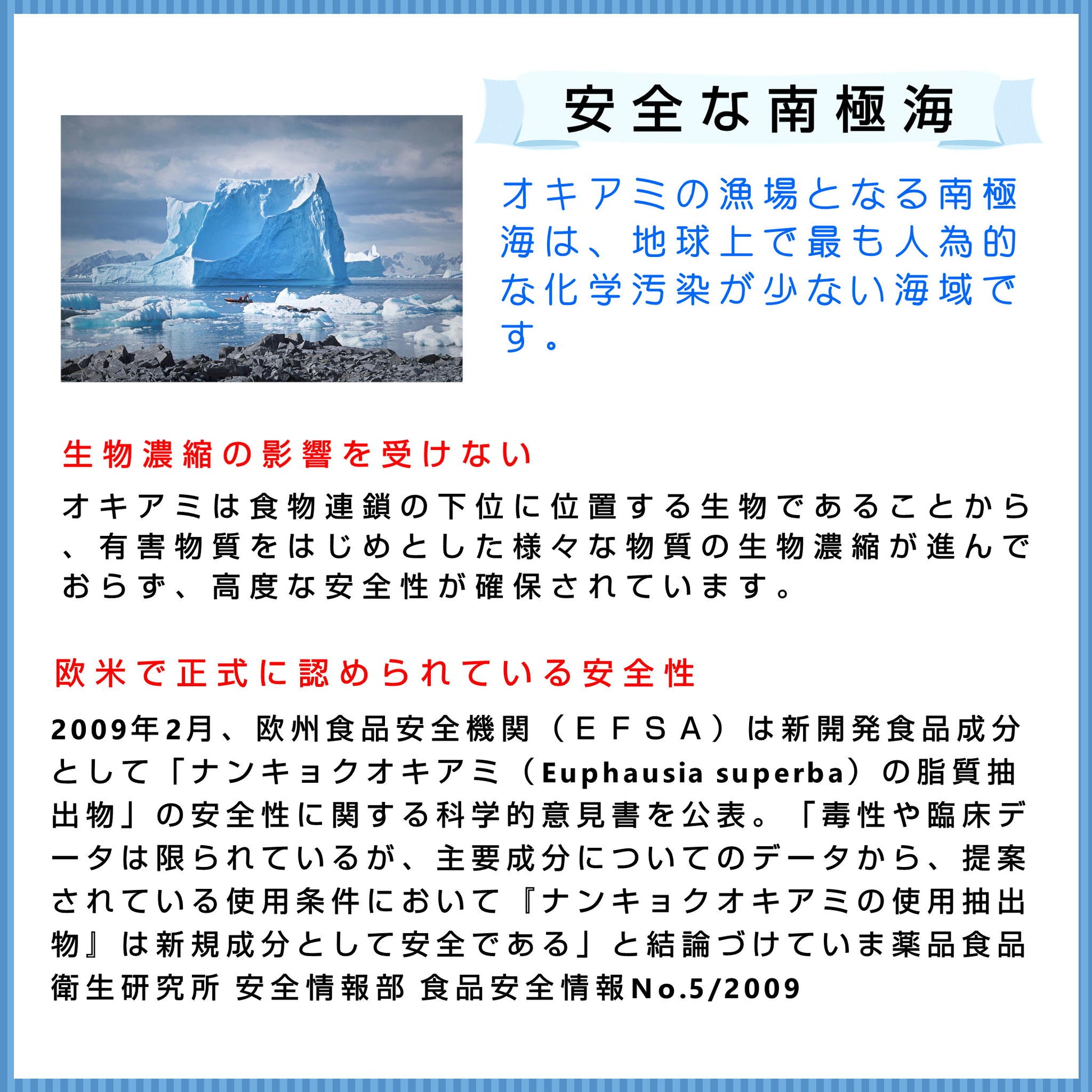 オキアミは食物連鎖の下位に位置する生物であることから、有害物質をはじめとした様々な化学物質の生物濃縮が進んでおらず、高度な安全性が確保されています。