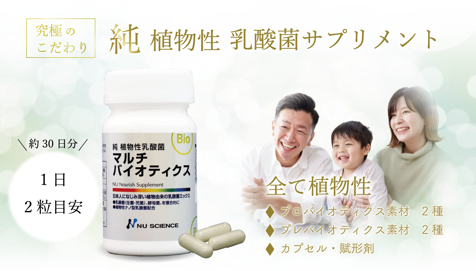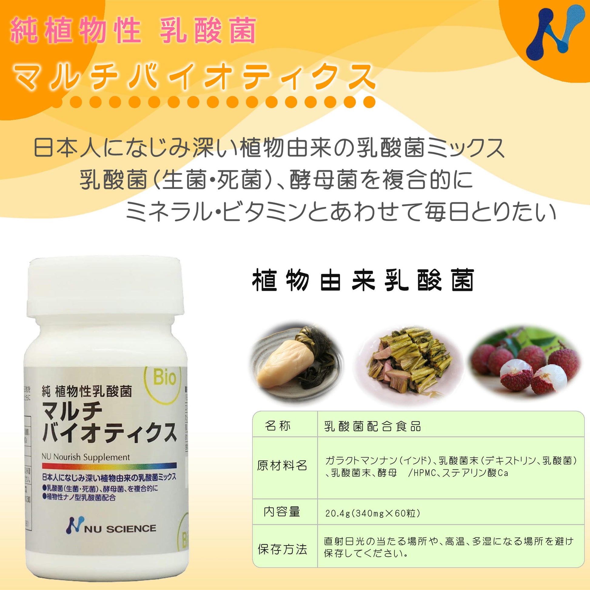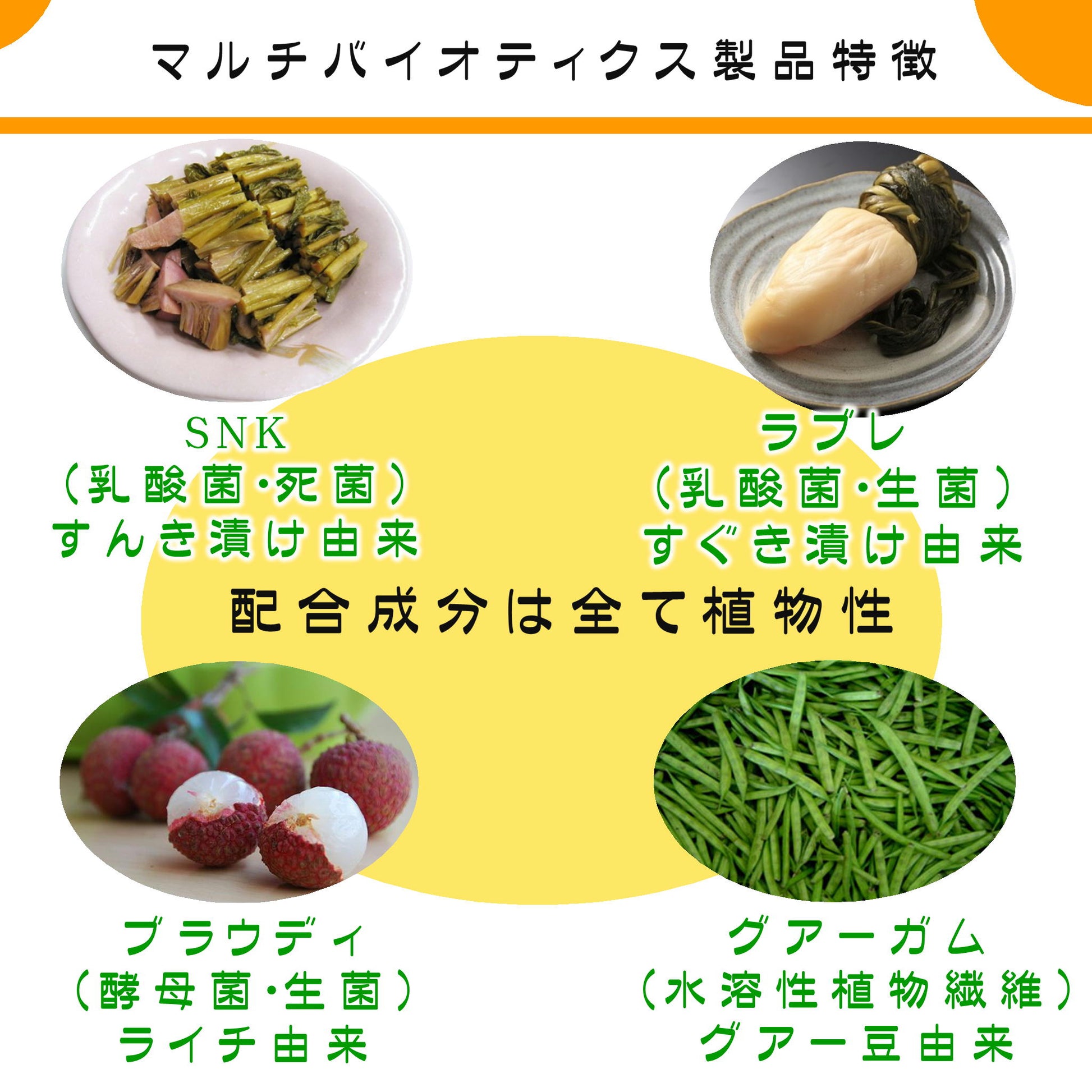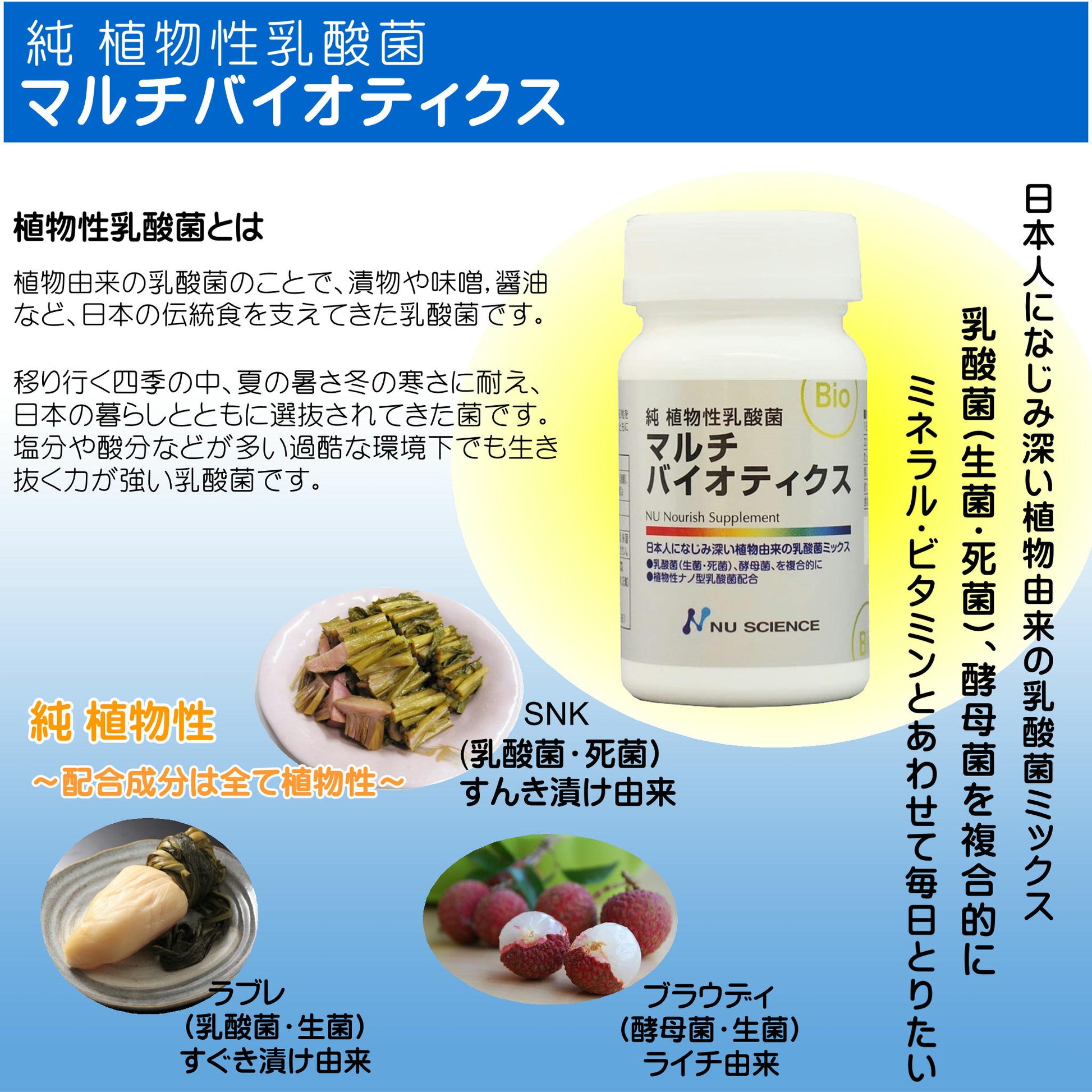 乳酸菌の生菌・死菌、酵母菌を複合的に配合したサプリメント。「すぐき」や「すんき漬け」など、植物由来の素材をサプリメント化。内容物に添加物不使用。