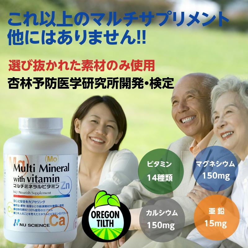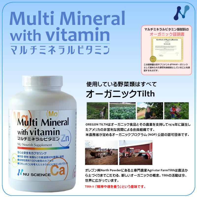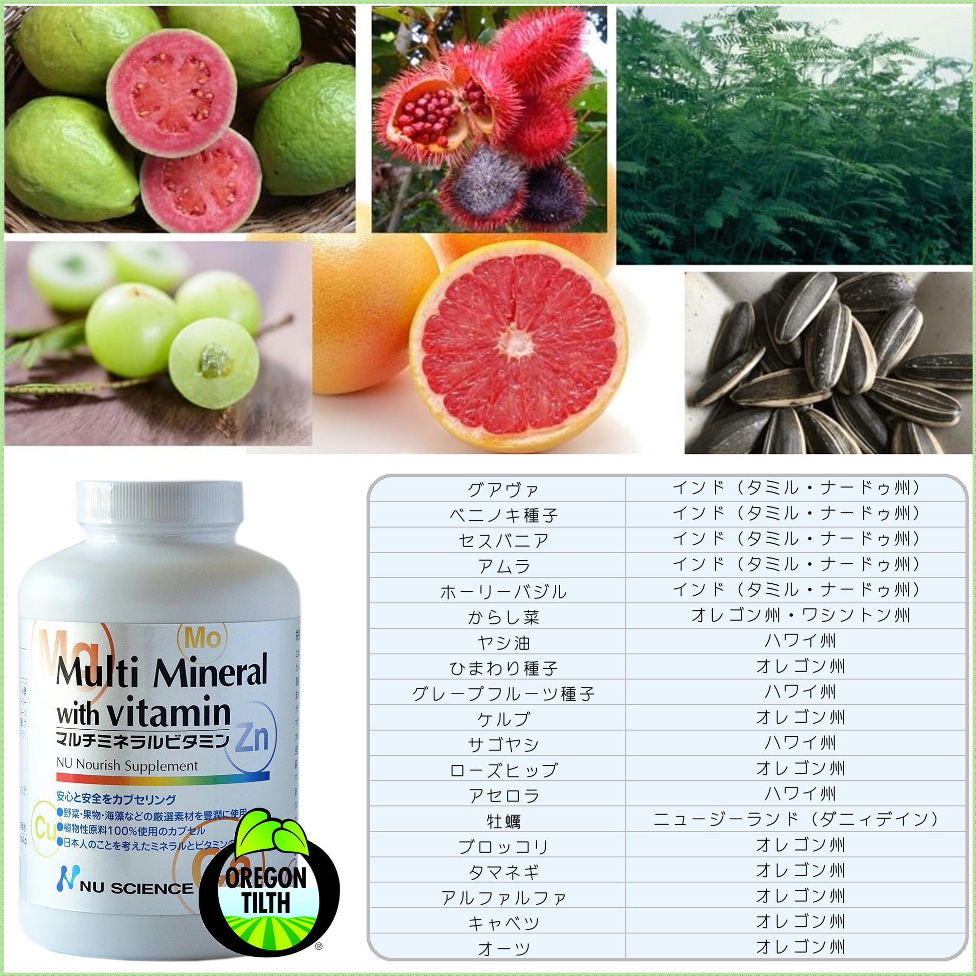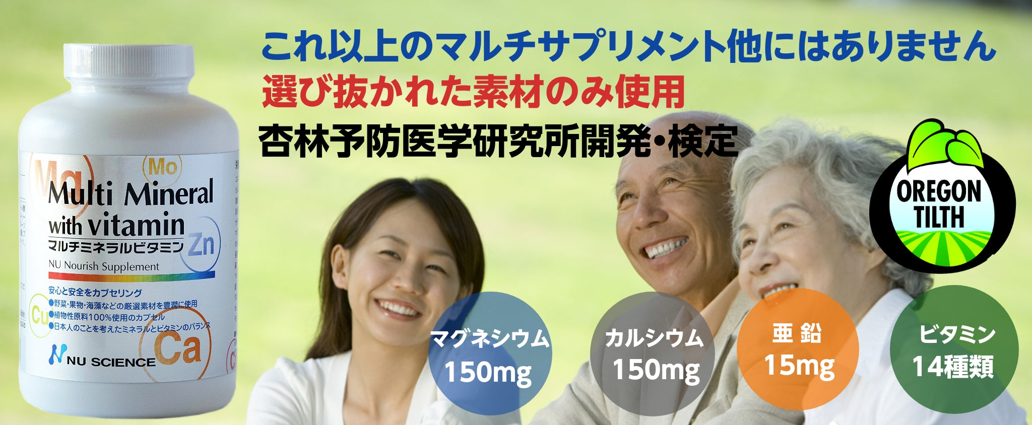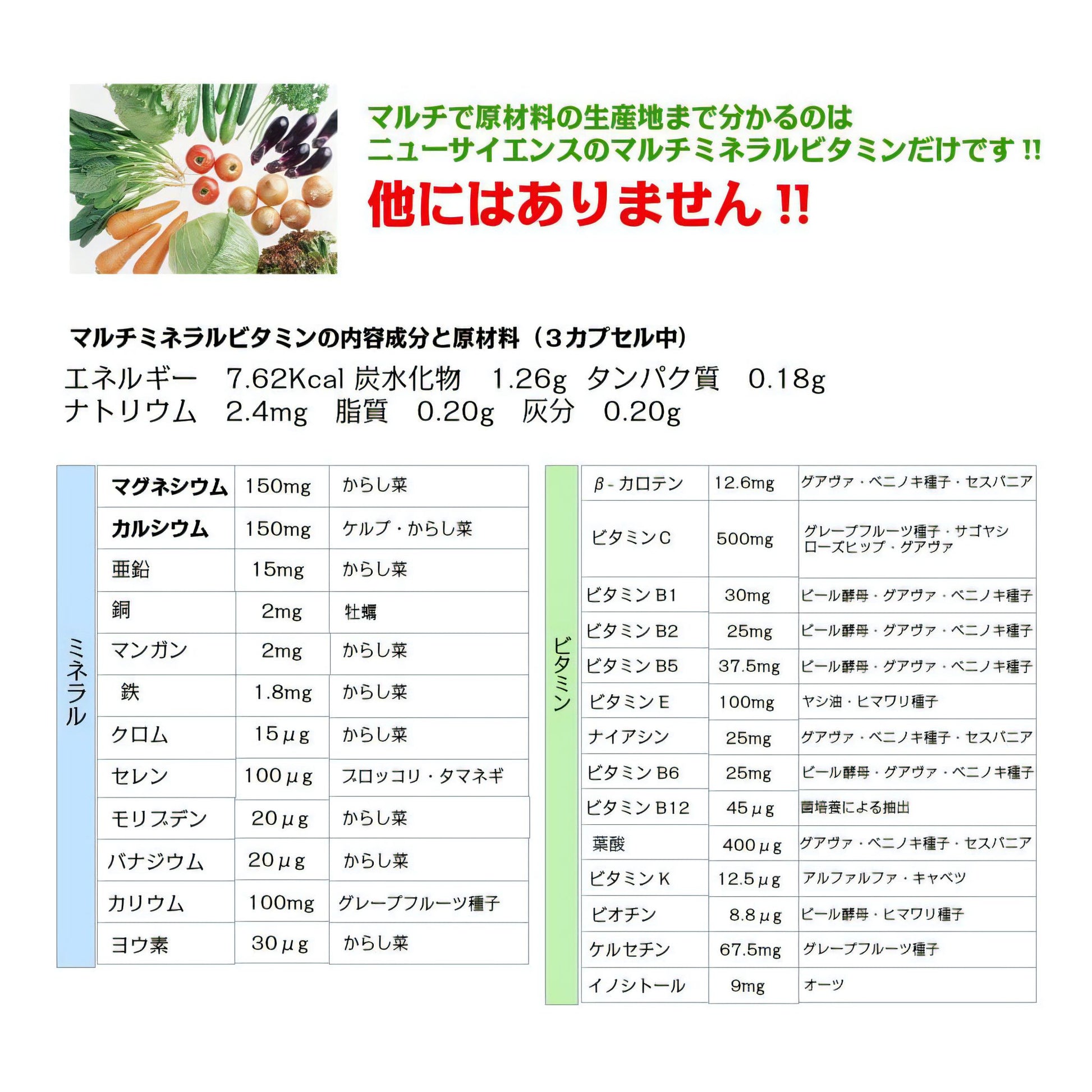 日本でただ一つ無農薬オーガニック証明書付マルチミネラルビタミン。原材料の生産地まで分かるマルチサプリメントは、ニューサイエンスのマルチミネラルビタミンだけです。ビタミン・ミネラルは日本人の特性にあわせ配合されています。マルチビタミン・マルチミネラルを別々に利用されている方にこれ一つで大丈夫1日わずか158円で健康に!プロアスリートも使用している最高のマルチミネラルビタミンを是非お試しください!