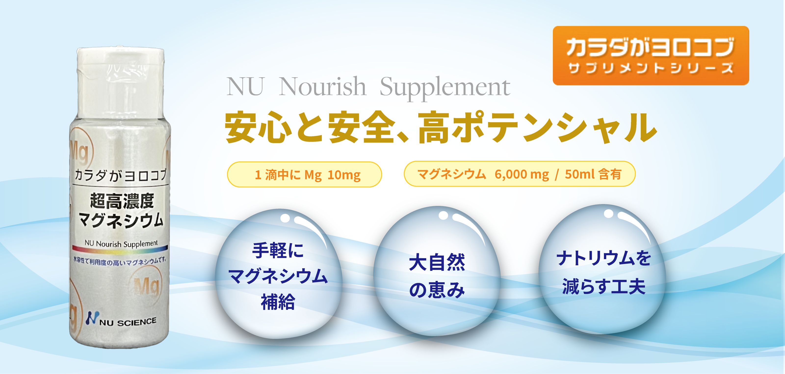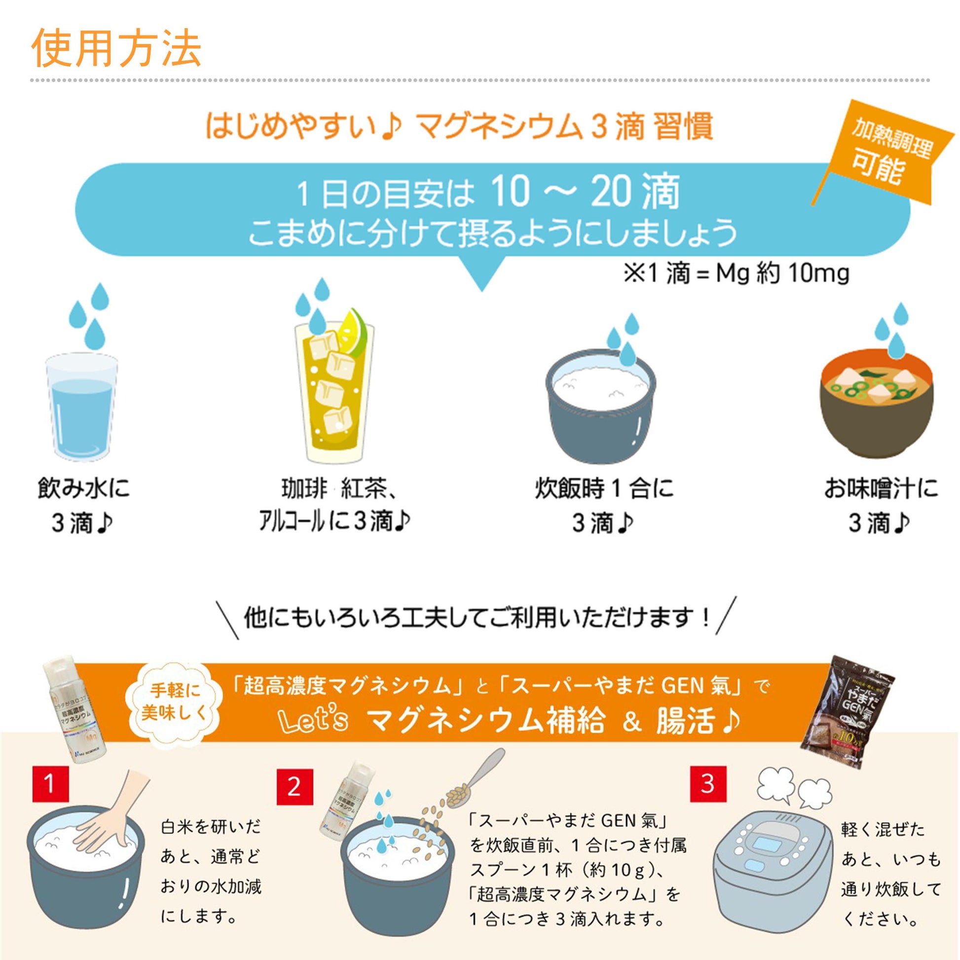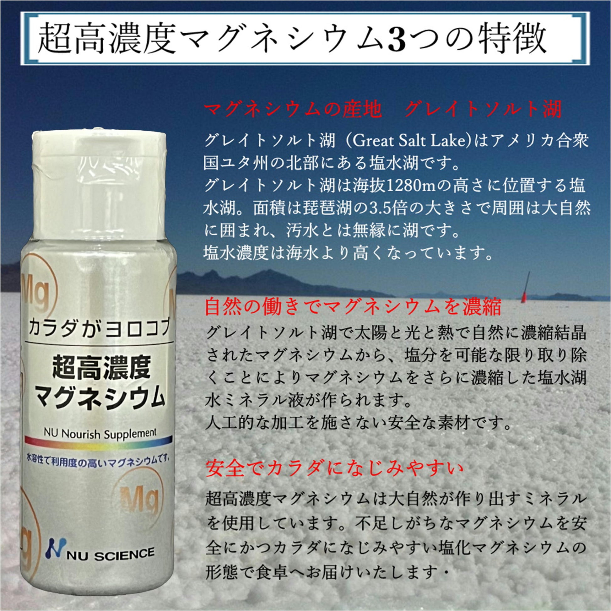 超高濃度マグネシウムは大自然が作り出す天然ミネラル、マグネシウムを使用しております。不足しがちなマグネシウムを安全に、いちばん吸収されやすい塩化マグネシウムの形で食卓へお届けします。