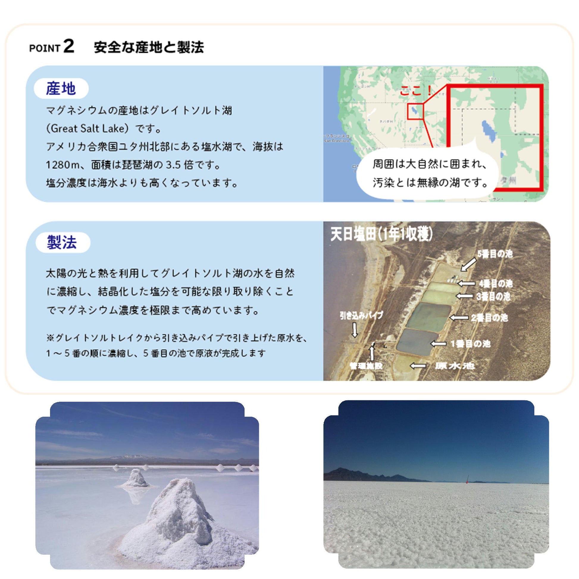 グレイトソルトレイク(Great Salt Lake)はアメリカ合衆国ユタ州の北部にある塩水湖です。海抜1280mの高さに位置し、面積は琵琶湖の3.5倍の大きさを誇ります。周りを囲むロッキー山脈やウオサッチ山脈などをミネラル供給源にもつ出口の無い湖で、汚染とは無縁の湖です。さらに、超高濃度マグネシウムの原液は特に汚染とはかけ離れたグレイトソルトレイクの北岸から採取されます。