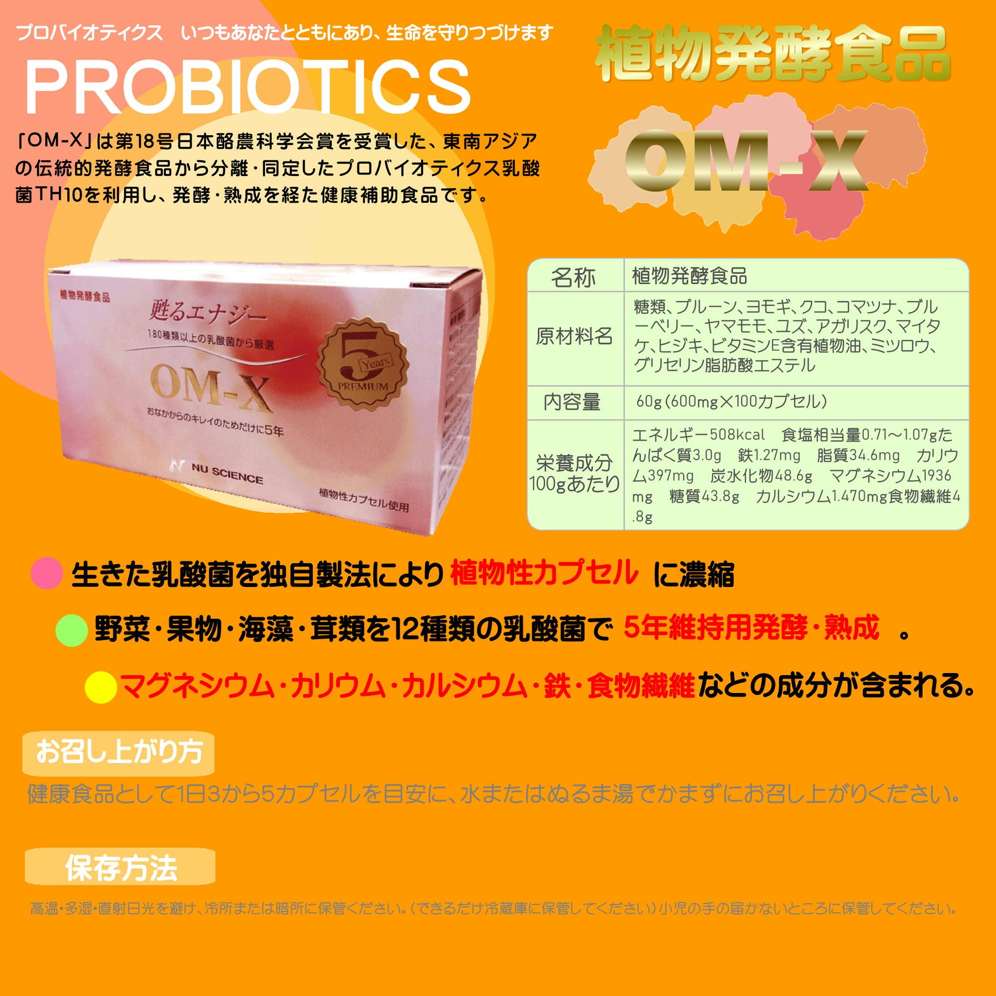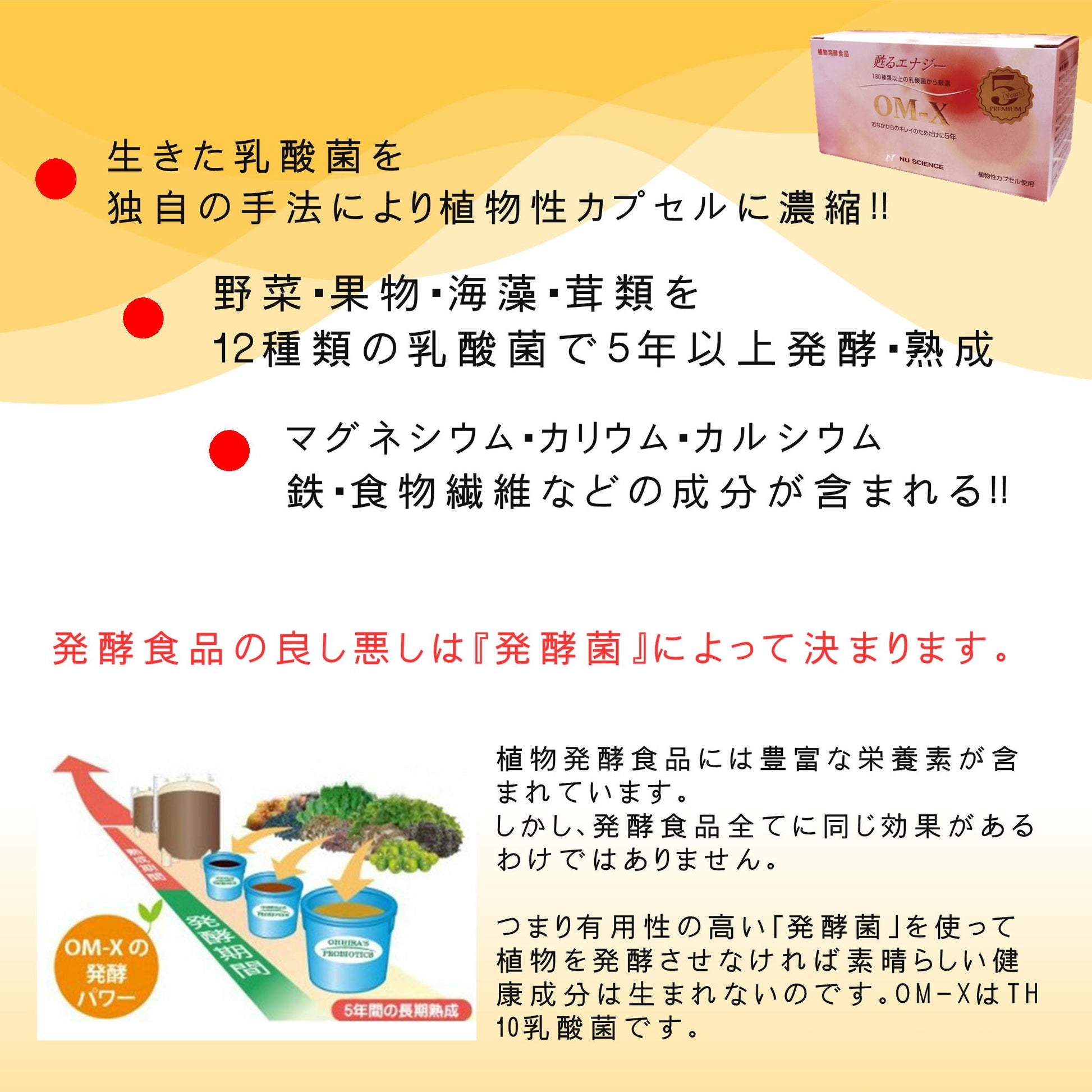 OM-Xは独自の乳酸菌で野菜・果物・ 海藻・茸類を5年間発酵させた植物発酵食品です。 10数種類の生きた乳酸菌をソフトカプセル化しております。