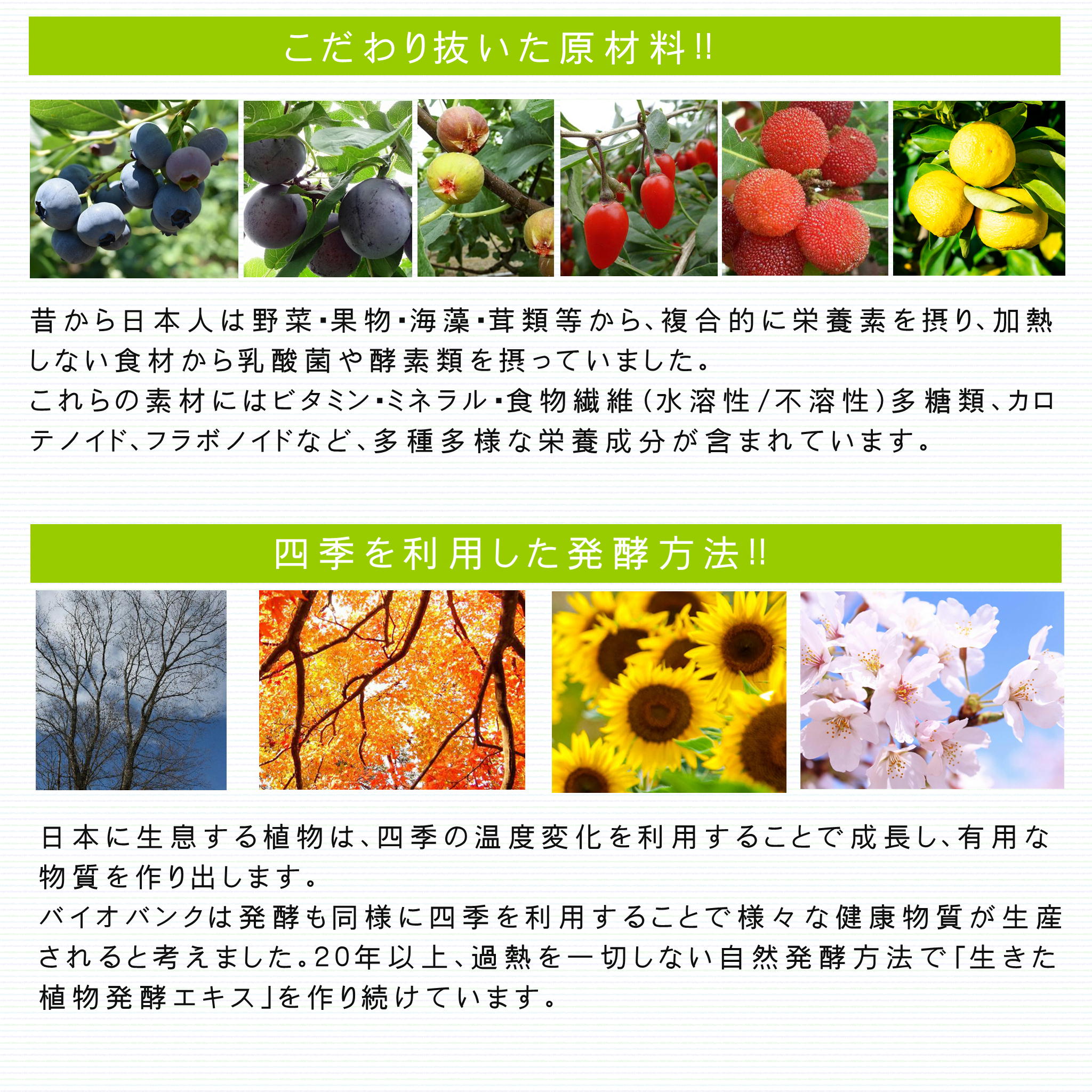 原材料名 | 糖類、プルーン、植物性タンパク(大豆)、ヨモギ、シイタケ、イチジク、ニンジン、コマツナ、ダイコン、キャベツ、食塩、ユズ、マタタビ、ワカメ、ヒジキ、ヤマモモ、アケビ、セロリ、キュウリ、クコ、ブルーベリー、アガリクス、マイタケ、タマネギ、ゴボウ、ホウレンソウ、コンブ、スギナ、ナシ、クチナシ、アオノリ、トマト、ピーマン、モヤシ、ナス、レイシ、レンコン、カボチャ、ショウガ、レタス、ニンニク、ミツバ、ウド、クマザサ、タンポポ、オオバコ、アスパラ、トウモロコシ、アカメガシワ、ドクダミ、ギシギシ、モロヘイヤ、シュンギク、ツユクサ、ケール、ヤマブドウ、グミ、アンズ、クワノミ、ツルドクダミ、桑の葉、杜仲葉、ビワ葉、柿の葉、ウメ、カリン、カワラタケ、キクラゲ、ハナビラタケ、ヒラタケ、ザクロ、アラメ、フキノトウ、パイン、イチゴ、ハクサイ、ブドウ、カブ、サラダナ、エノキタケ、イタドリ、ニラ、マツバ、アサツキ、シソ、テングサ、エゾウコギ、セリ、サフラワー油、カイガラ末、ビタミンE含有植物油、加工デンプン、グリセリン、グリセリン脂肪酸エステル、カラギナン、ミツロウ、カラメル、大豆レシチン(原材料に大豆を含む) |